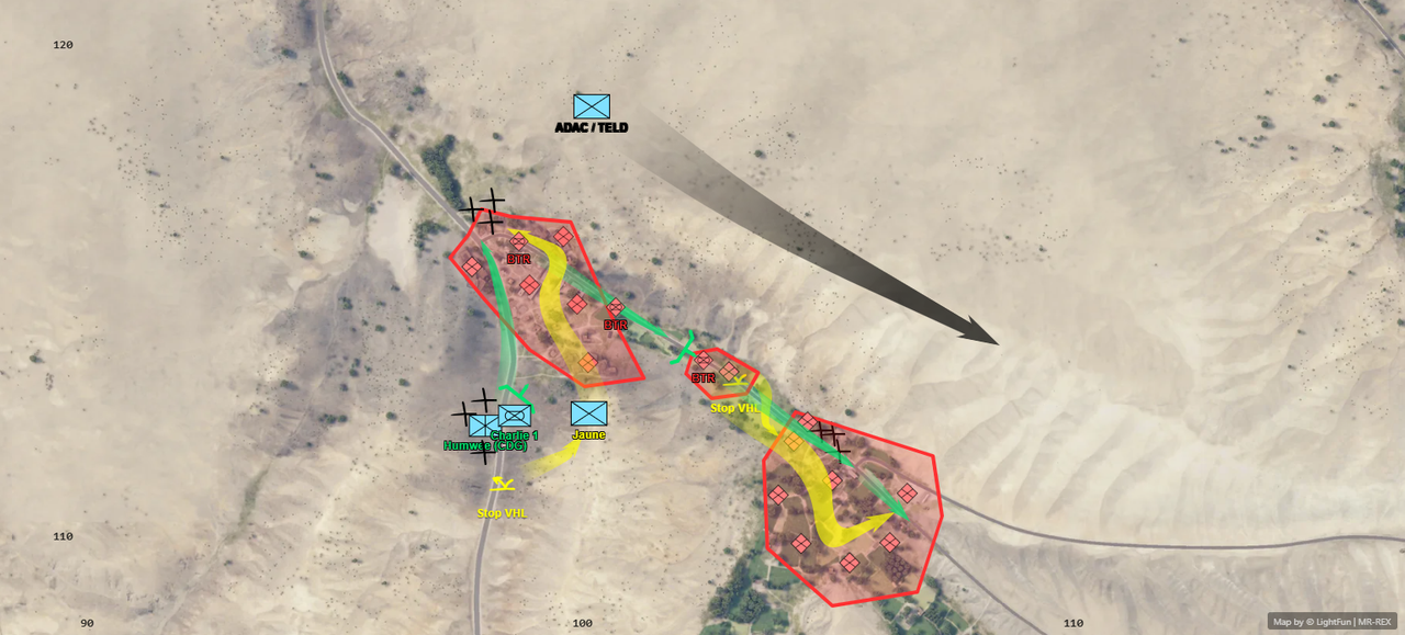 Multiplication des rapports de contact blindés (BTR). Confusion temporaire sur le nombre et la position des vecteurs ENI. Identification acoustique formelle d'un BTR (cal. 14.5mm) au niveau du carrefour central lors du survol de l'élément HOTEL. Neutralisation ultérieure par Jaune.